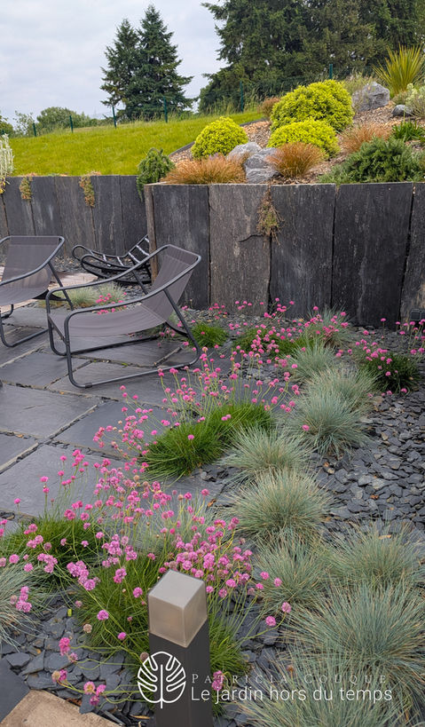 REPOUSSER ce volume de terre et le CONTENIR avec élégance pour laisser place au grand bassin. LAISSER ADMIRER cette très belle PERSPECTIVE minérale édifiée en schiste au reflet rouille en venant l'agrémenter à ses pieds d'une rivière de paillettes d'ardoise et en l'habillant en son sommet de quelques plantes au feuillage retombant en cascade pour apporter du vivant et de la couleur à ce tablier minéral de caractère.