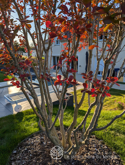 D'un côté une invitation à la contemplation et l'évasion en dressant une plage minérale PANORAMIQUE à mi hauteur et dont l'accès singulier se fait par son escalier intégré en corten aux couleurs orangées et marches en débord au sol entre deux cistes couleur crème pour inviter ses hôtes à faire le premier pas... jouxtant cette mini plage dominatrice en ardoise avec vue plongeante sur la piscine et l'ensemble du jardin, la silhouette d'un lagerstroemia majestueux et son port légèrement tortueux pour laisser danser nos esprits et savourer cette position stratégique